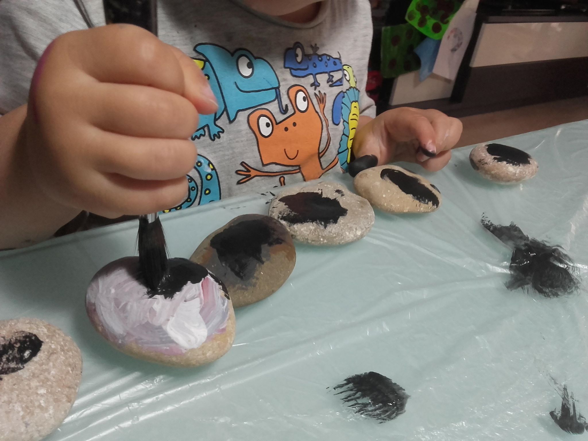 Beneficios de esta actividad: Además de proporcionarle al niño el placer gratificante de estar en contacto con la naturaleza al hacer la recogida de piedras, al ser una actividad artística desarrolla la creatividad, la imaginación y la concentración.