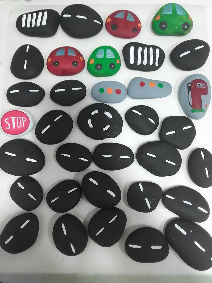 ¡Listo! Cuando la pintura seque, tendréis las hermosas piedras pintadas a usar en este juego de crear en casa una auténtica vía pública en la que vuestros vehículos circularán según vuestro antojo.