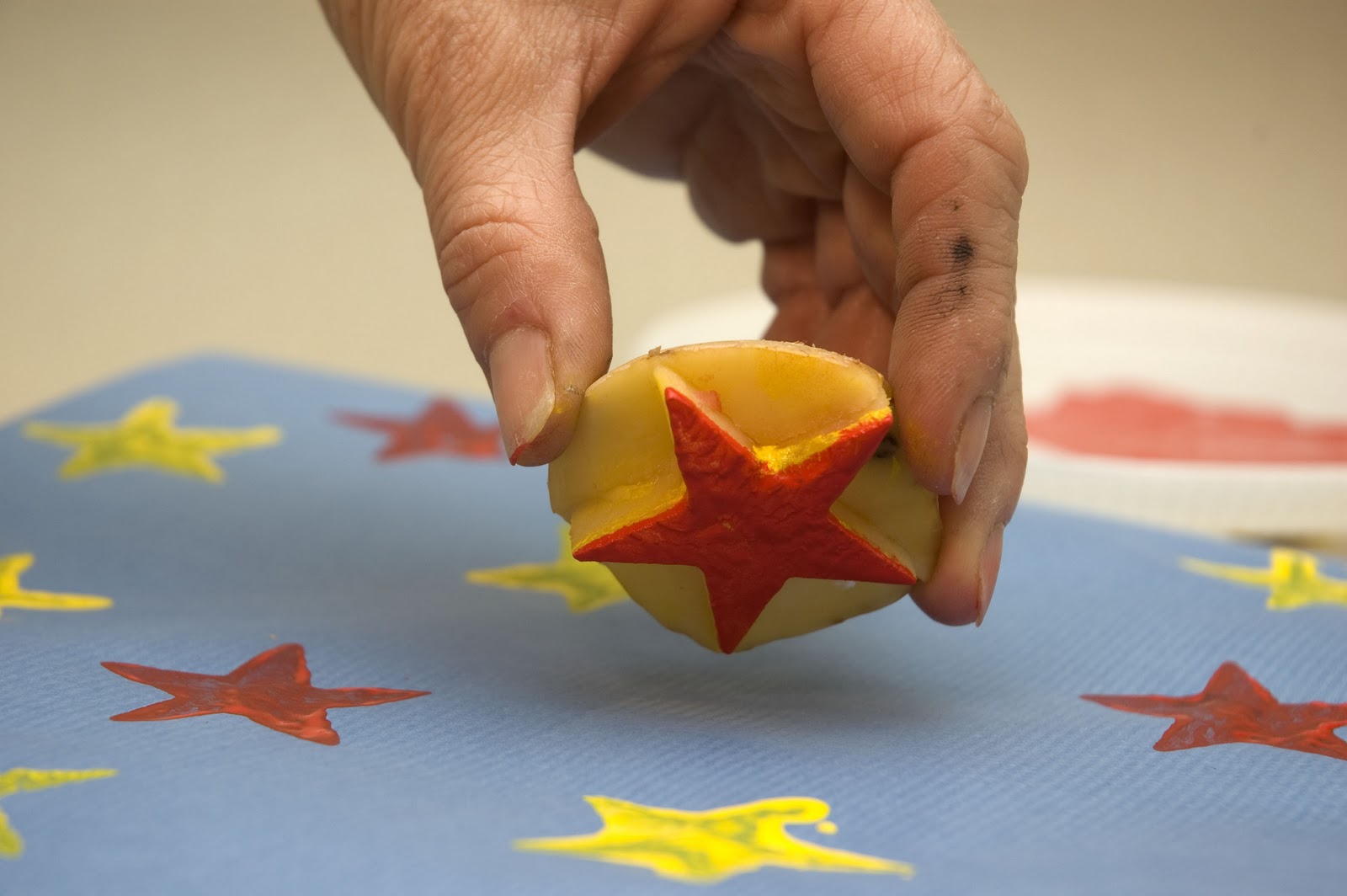Sobretodo deja secar del toda la pintura antes de envolver tus regalos! - Para decorar el papel con patata primero deberás hacer tus «sellos para estampar». Corta la patata por la mitad y clava en ella el cortador.Quita con un cuchillo los trozos de patata que sobran del dibujo. Moja el molde en distintos colores y ya estarás listo para estampar tu papel de regalo!