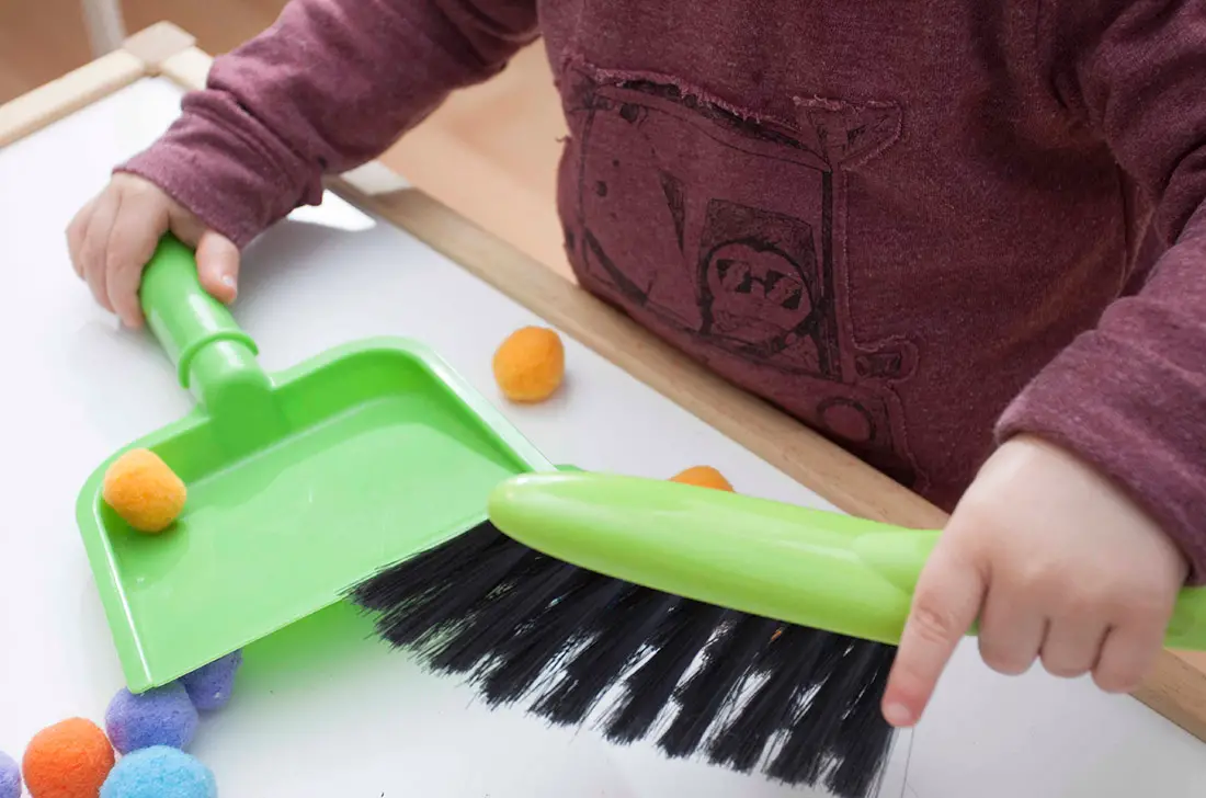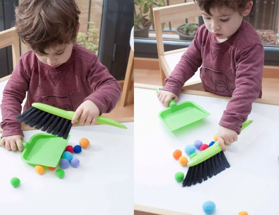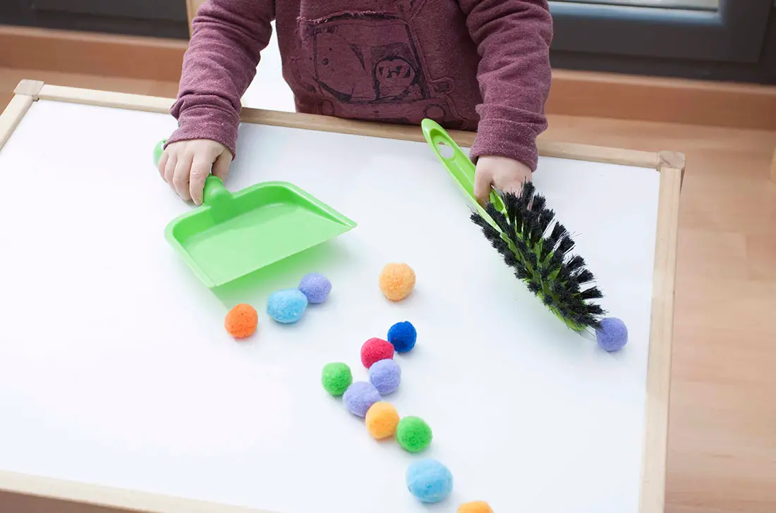 La actividad que realizaremos hoy es muy simple, y a la vez muy útil para estimular la fuerza, la agilidad y la coordinación:  vamos a recoger pompones con un recogedor de mano. Se trata de una actividad indicada para niños a partir de 2 años.